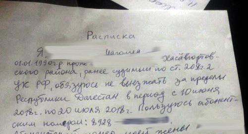 A sample of the letter about not leaving the republic was published in the "Ask Rasul" Telegram channel. "I undertake not to leave the Republic of Dagestan during the period from June 10 to July 20, 2018," the letter reads.