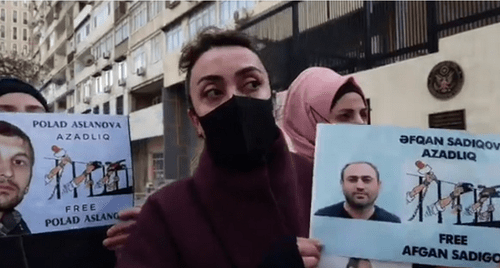 Spouses of two sentenced journalists – Polad Aslanov and Afghan Sadygov – also attended the protest action. Together with them, female activists from the Popular Front Party of Azerbaijan (PFPA) took part in the protest.