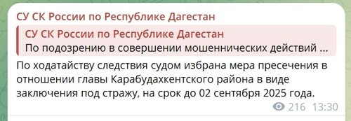 At the request of the investigation, the court chose a measure of restraint for the head of the Karabudakhkent district, the Dagestan department of the Investigative Committee of the Russian Federation reported today on its Telegram channel.