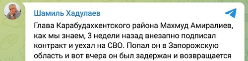 Makhmud Amiraliev "suddenly signed a contract three weeks ago and left for the North Military District," he reported on his Telegram channel on July 5 Chairman of the Public Monitoring Commission of Dagestan Shamil Khadulaev. "He ended up in the Zaporizhzhya region and yesterday he was detained and is returning back," he wrote.