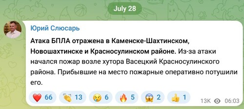 The military shot down drones launched from Ukraine in Kamensk-Shakhtinsky, Novoshakhtinsk and Krasnosulinsky districts. A fire broke out near the Vasetsky farm as a result of the attack.