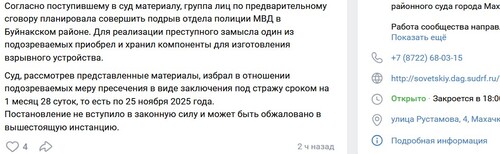 Four Buinaksk residents suspected of plotting a terrorist attack against Ministry of Internal Affairs employees have been taken into custody, the Sovietsky District Court of Makhachkala announced today on its VKontakte page, choosing a preventive measure for the detainees.