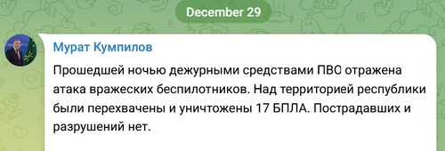 "Last night, air defense systems on duty repelled an attack by enemy drones. Seventeen UAVs were intercepted and destroyed over the republic's territory. There were no casualties or damage," he wrote.