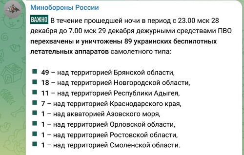 Earlier, from 8:00 PM to 11:00 PM Moscow time on December 28, 21 drones were intercepted and destroyed: 10 over the Rostov region, seven over the Sea of Azov, and four over the Krasnodar region, according to another publication by the Ministry of Defense.