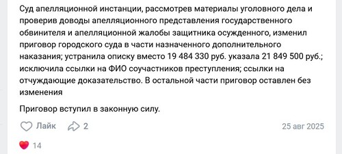 "The court of appeal, having examined the materials of the criminal case and checked the arguments of the appeal submission of the state prosecutor and the appeal of the defense attorney of the convicted person, changed the verdict of the city court in terms of the additional punishment imposed; corrected a typo instead of 19,484,330 rubles indicated 21,849,500 rubles; excluded references to the full names of accomplices to the crime; references to "alienating evidence. The rest of the sentence was upheld. The sentence has entered into legal force," the joint press service of the republic's courts reported that day on its VKontakte page, without specifying the extent to which Safonov's additional punishment had been changed.