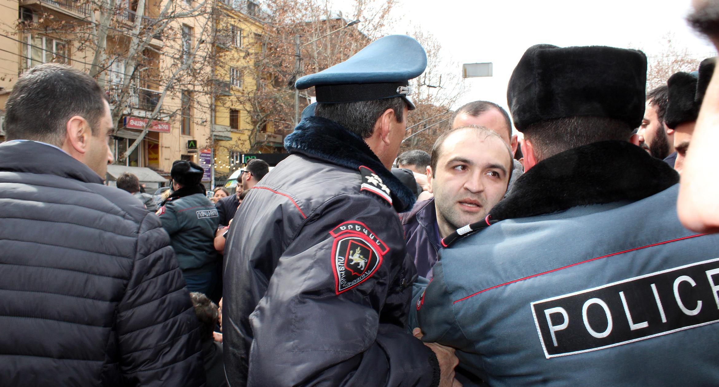 The protest by owners and staff of the cafés was triggered by the decision of Yerevan authorities to demolish several cafés in Freedom Square. The city authorities insist that the territory around the Academic Opera and Ballet Theatre was built up voluntarily; and the surroundings should be returned to their historical appearance. In their turn, protesters assert that the café demolition will make over 200 people jobless. On March 14, participants of the spontaneous rally blocked Mashtots Avenue in protest. The police managed to push the protesters away from the roadway to the sidewalk and restore the traffic. During the skirmishes of protesters with the police, four people were injured. 41 participants of the action were detained, 25 of them were released by the police by the end of the day. Photos by the Caucasian Knot correspondent Tigran Petrosyan.
